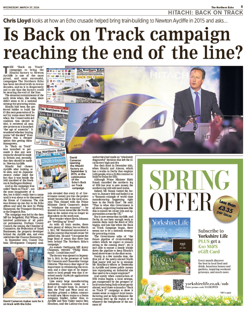 2024The Northern Echo launched their campaign ‘Keep Hitachi on Track’ to urge the government to step in and help train builder Hitachi by extending a vital contract to secure the future of its Newton Aycliffe plant. Business leaders, unions and politicians backed the call, as hundreds of jobs were at risk with the company’s order books running dry.
