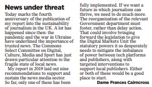 She said: “Today marks the fourth anniversary of the publication of my report into the sustainability of journalism in the UK. A lot has happened since then: the pandemic and the war in Ukraine have underlined the importance of trusted news. The Commons Select Committee on Digital, Culture, Media and Sport has just drawn particular attention to the fragile state of local news.
